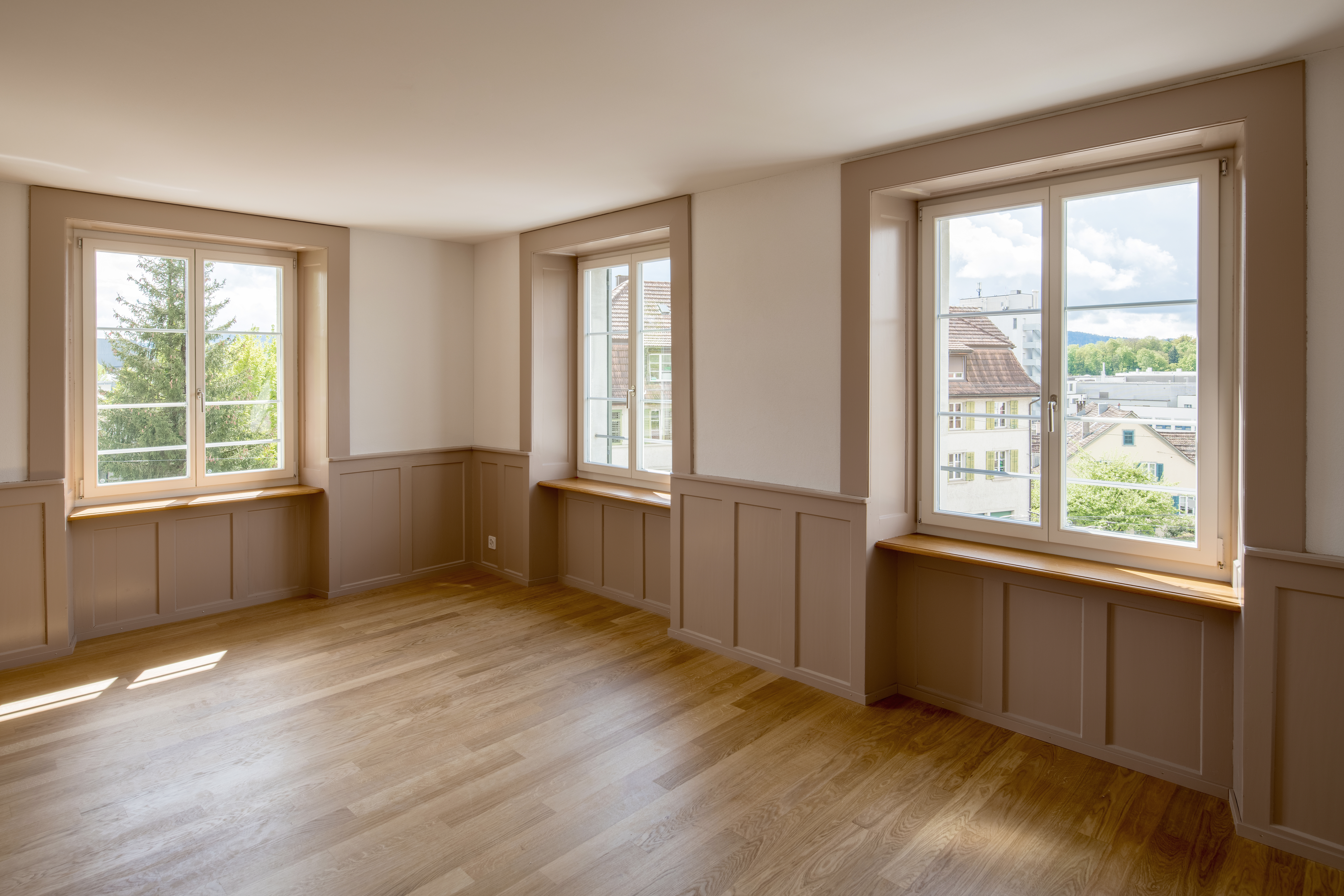 In der einen Wohnung im 2.OG wurde Holzwerk Täfer in Zusammenarbeit mit der Denkmalpflege wieder in Bunttönen gestrichen. Es erhielt je nach Raum einen beigen Farbton, ein zartes Grün oder ein zartes Blau.